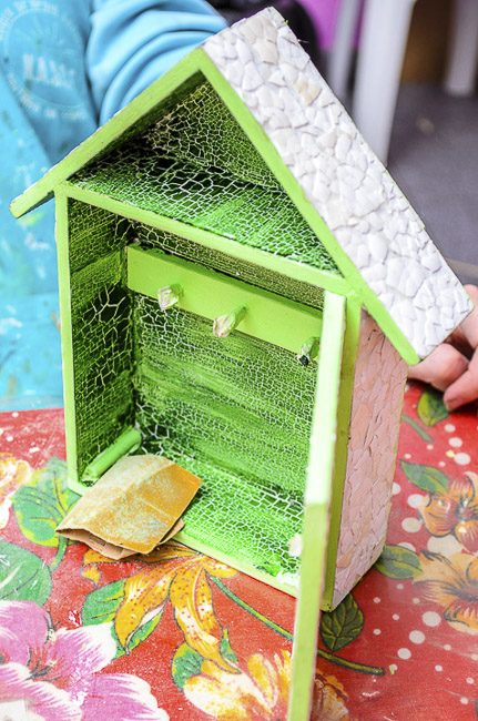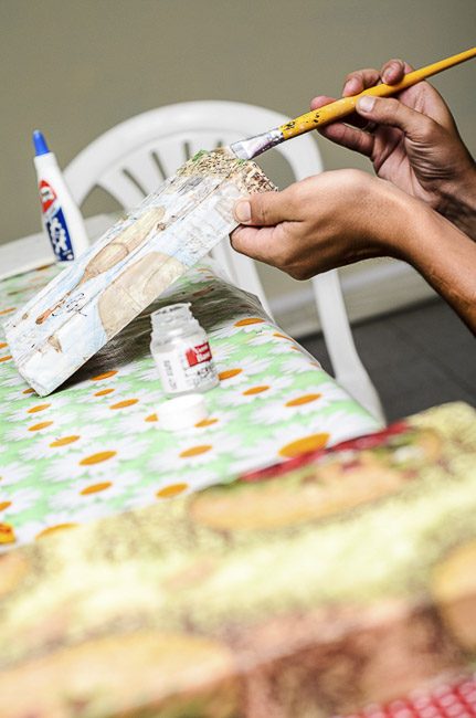O processo é dividido em partes: preparar a madeira, montar o produto, fazer os desenhos e por fim, a pintura e o acabamento.